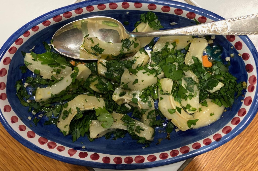 When I say today, I mean yesterday. Any day. I heated the salami, the mushroom and the patatas braves in a pan. Scrambled 2 eggs. Added S+P. My BIL who does not eat eggs with yolks wanted to know if there was any more. As an aside, you do not have to go to Madrid to make an omelet. Any good leftover stuff works. But this was really good because of the shared meal in Madrid the night before with my sister and BIL.