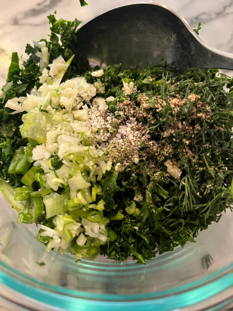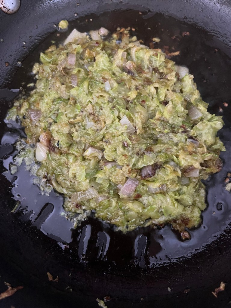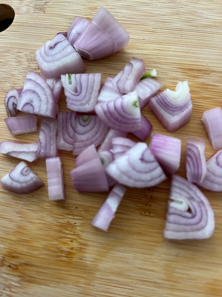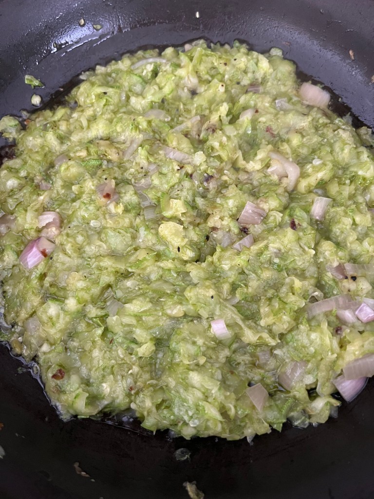 Chop shallot and add to zucchini bowl. No shallots? Use onion. Use scallion. Use garlic, but sparingly. You want to taste zucchini.