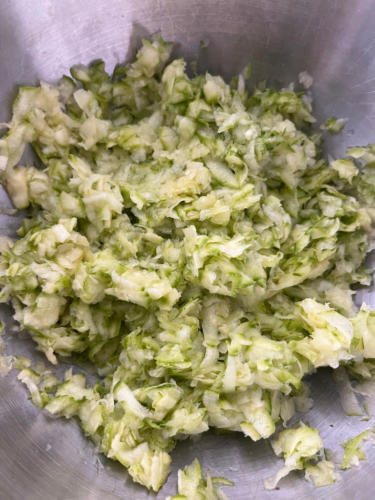 To make. Grate your zucchini on your box grater using the largest holes. If you want to break out the food processor, just pulse a few times to get the size shown below. Do not over process, you are not making soup, you are making butter. It should be mentioned that any color of zucchini or summer squash can be used. I think, as the product arrives at markets or in stores, the smaller varieties would be better because they are sweeter but do not let lack of small vegetables deter you from making this. Your grated product should look like this.