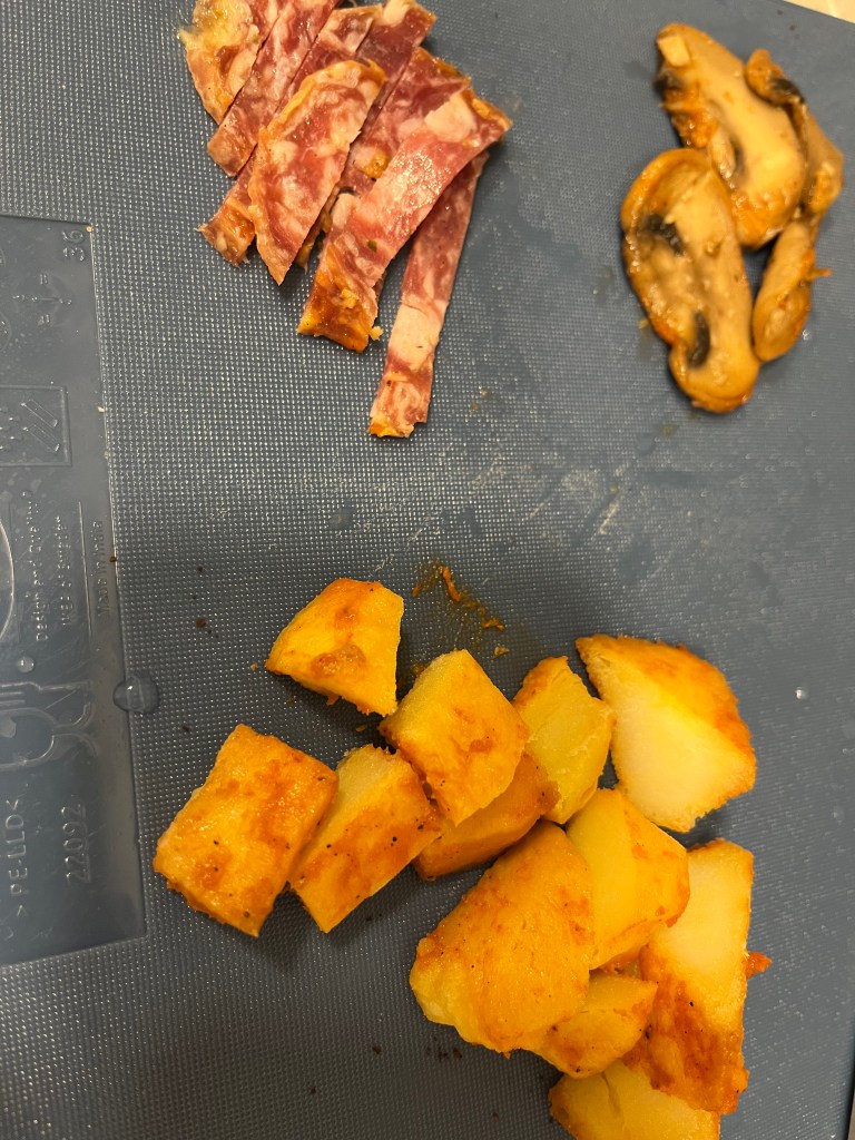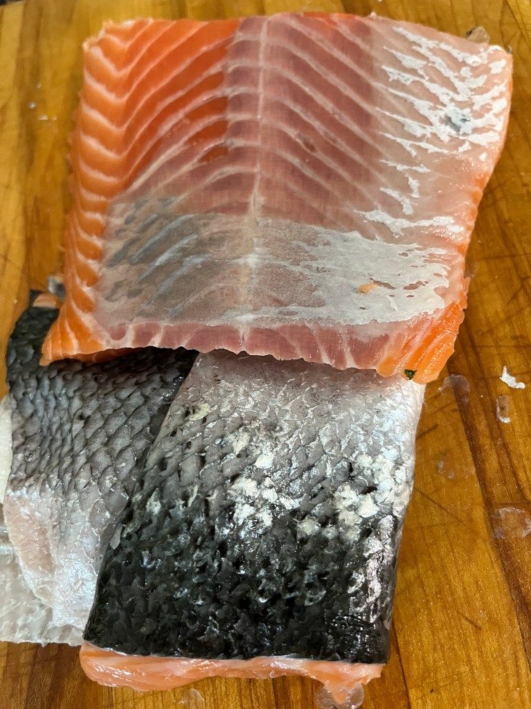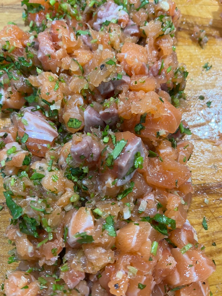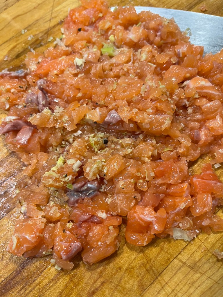 Add the remaining salmon chunks to this minced down product and continue to chop all together keeping the bigger chunks bigger than the minced bits but making a somewhat homogenous mix.