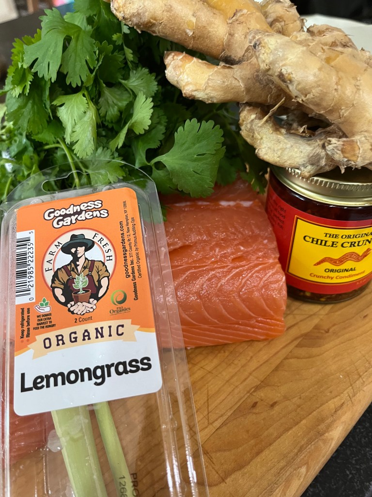 For this recipe, I used 2 pounds of Atlantic salmon which I skinned. If you are not comfortable skinning the fish, ask your fish purveyor to do it for you. It is quite easy and the skin makes fabulous cracklings. Different recipe….. Also needed were 2 stalks of lemon grass (use lemon rind or lime rind if you cannot find lemon grass and taste for flavor), about a 1-1/2 inch piece of peeled ginger, a bunch of cilantro, and chili oil. I make my own chili oil so I used that, but included a picture of what you need should you make this. Cooking time is enough time to fry the cakes, but allow about 1/2 hour before cooking for resting in fridge.