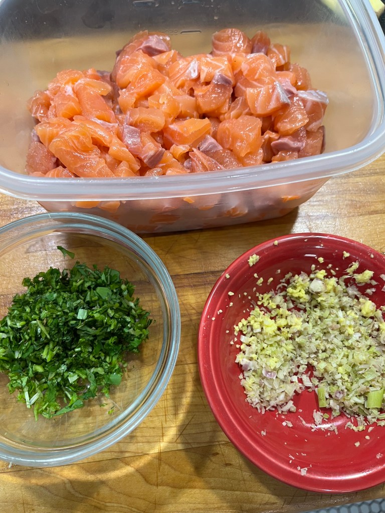 Now take 1/2 of the cubed salmon and cut down to almost a paste. You can do this in a food processor, but why take out a piece of equipment when a knife works just as well and is easier to clean! Besides, great stress reliever….. Add the lemon grass/ginger mix as you chop. You will. have this: