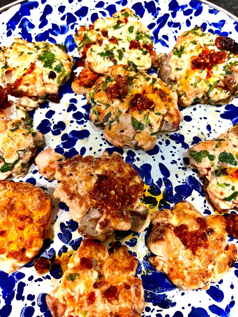 This is a riff on a Jamie Oliver recipe. I will start by saying that. There are some changes, however, so do not call out the plagiarism police on me! After all, as Coco Chanel said, “imitation is the highest form of flattery”. The idea came about because we were having a family nibble night for a myriad of celebrations. College graduation, impending birthday, upcoming family reunion for July 4th. There were a lot of tastes involved and we all contributed something in some way. My niece, Anna, is beginning to try seafood after years as a vegetarian. So I thought of a recipe that I had seen on the Jamie Oliver channel and thought I could downsize the cakes (hence cakelets). I gave her a list of ingredients and she loved them all so we decided to make them together. From start to finish. Including tasting for taste. It was great fun. I give you Salmon Cakelets.