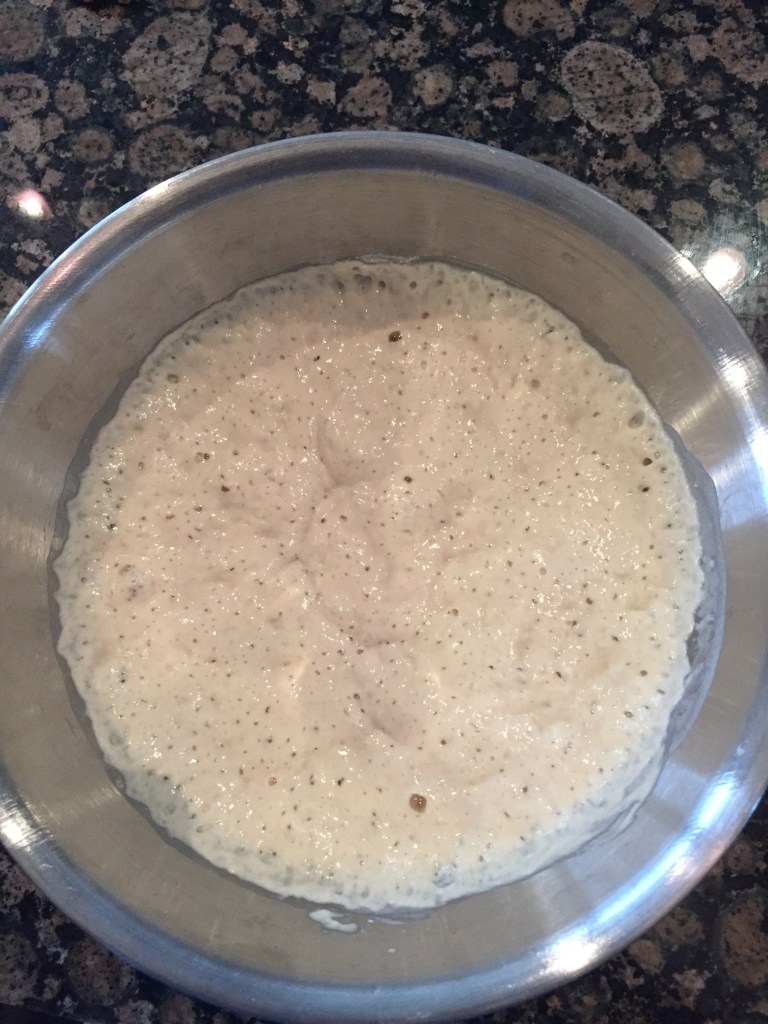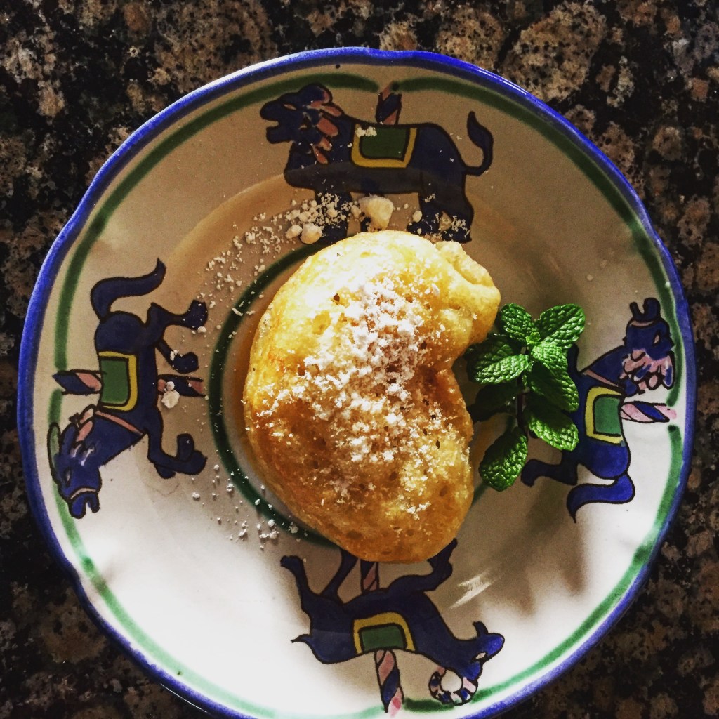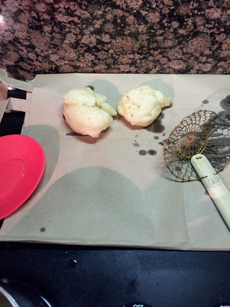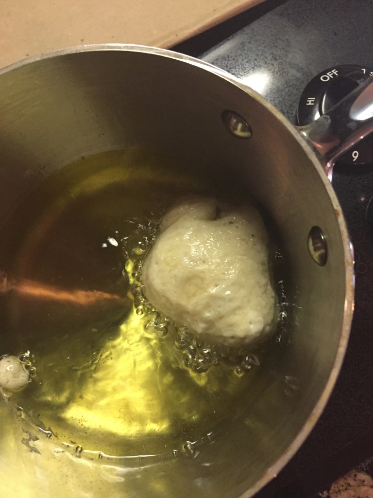 I come from a family with a lot of Josephs: Mother, grandparents, brother, cousins, you know, a lot. So March 19 has a special place in my heart, not only because it is the St. Patrick’s Day equivalent for Italians, but also because of the fried dough nibbles my mom (and my grandmother, my aunts, my sister, you get the picture) would make to celebrate the date. So today, I bring you zeppole. Not a very sophisticated recipe, but so good. For ten zeppole each consisting of a quarter cup raw product, you will need one package of yeast dissolved in 1 1/4 cup warm water (proof to make sure it bubbles), 1 1/4 cup all purpose flour, and a pinch of salt. Mix the flour into the proofed yeast and water mixture, add pinch of salt and set aside to rise for about an hour and a half. You can make this the day before and let mixture rise in the fridge, just bring it to room temperature before cooking. Your mixture should be a bit soupy as shown in photo. When ready, bring about a cup of oil to high heat and set a paper bag-the paper bag is important, it is part of the tradition-aside and next to your pot. Add a 1/4 cup of mixture to oil and watch it fry. When the zeppole is cooked on one side, it will turn itself over, but if it doesn’t, just give it a nudge; you want both sides a golden color. That’s it. When ready to serve, dust with a bit of powdered sugar, or a mix of powdered sugar and cocoa powder or whatever you think you might like. You can probably serve them with something savory, but I am worried that my Italian ancestors will haunt your dreams for a year. In any event, enjoy. And if your name is Joseph or any close derivation thereof, I wish you a very happy feast day!
