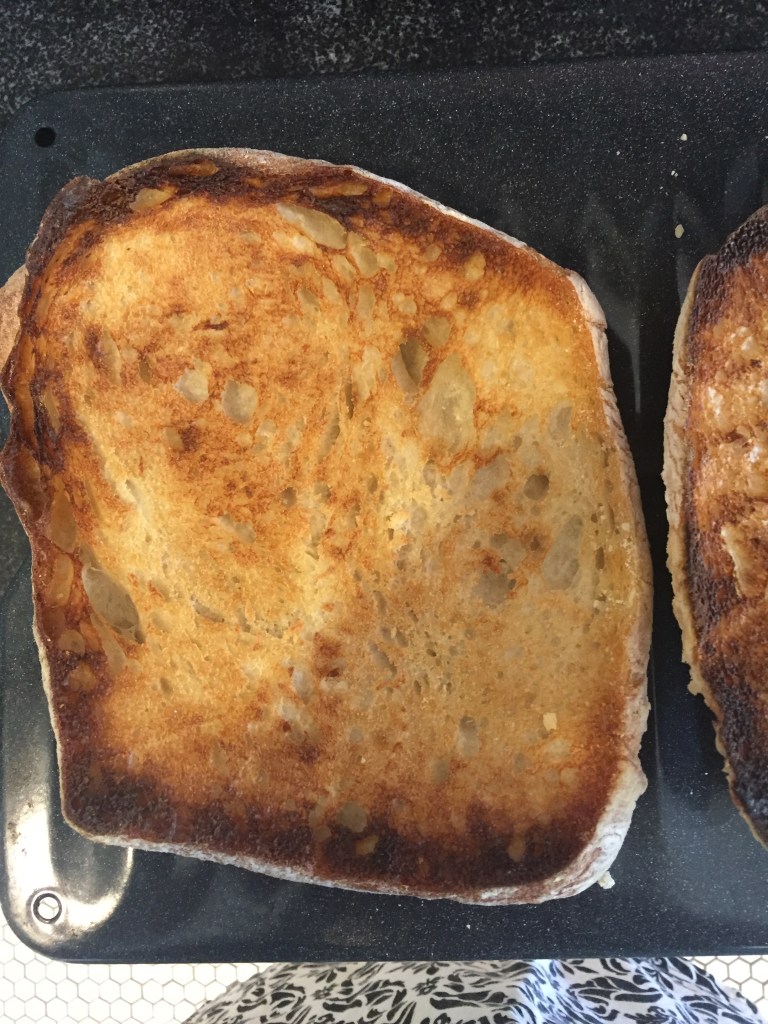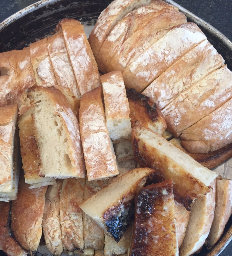 You have the ribs cooking, the burgers prepped, the dogs waiting patiently for their turn on the grill. Salads, cupcakes, all the stuff that make a BBQ on the Fourth what it is. So what’s missing? Scratch your head, um, er, aha! you forgot the garlic bread, what fourth of July celebration should be without it? (Well most of them if you aren’t of Italian heritage, but a post for a different date). So this is as easy as it gets. What you need is a loaf of Ciabatta bread (or loaf of your choice, but Ciabatta works best), a stick of butter (per loaf), chopped garlic (I use my microplane, this way you don’t get big chunks and the garlic melts into the butter), a rimmed baking sheet, and that’s it. If you want to get fancy and add chopped herbs, have at it, but wait until the butter garlic mix is done. Slice the Ciabatta loaf in half as shown so that you have two pieces. Grill the bread to get nice marks (or put under the broiler to toast), and set aside. While bread is grilling, place the butter and garlic in the baking pan and melt, stirring to make sure all blended. You can do this on the grill or in the oven as well. When the butter is melted and mixed with garlic (slightly toasty NOT BURNT) place the grilled sides of the bread on the sheet pan into the butter mix and let the bread soak up the mixture. Place the two sides back together, slice lengthwise, and VOILA! Best Easy Garlic Bread! You will never make it another way, I promise.